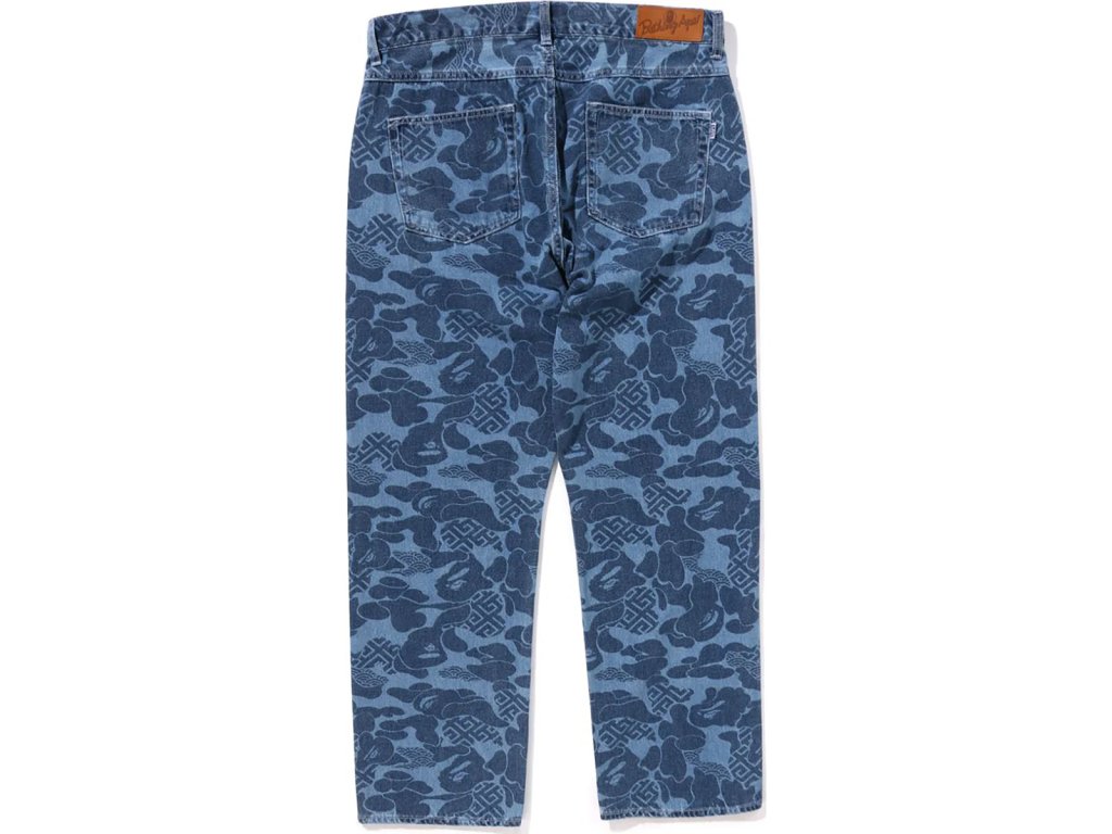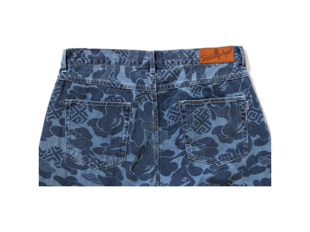 - Džínové kalhoty od japonské značky Bape (A Bathing Ape) v modré barvě.