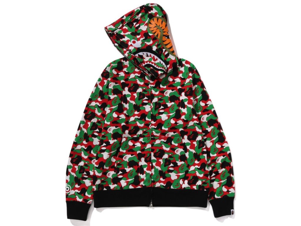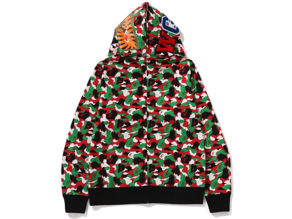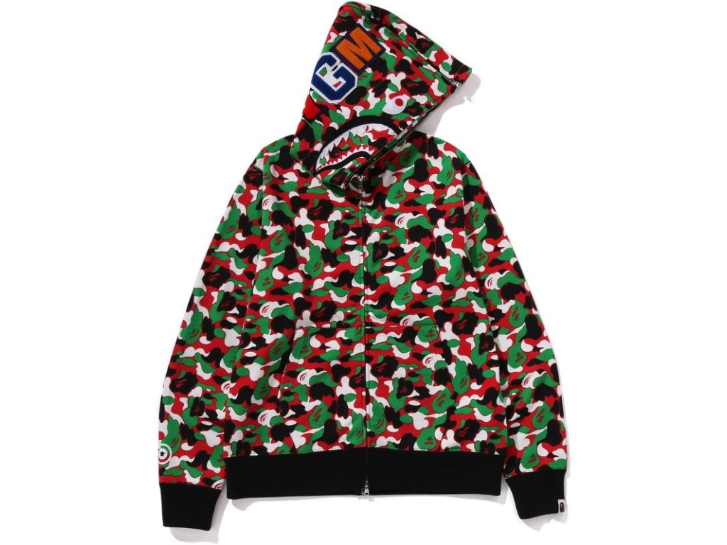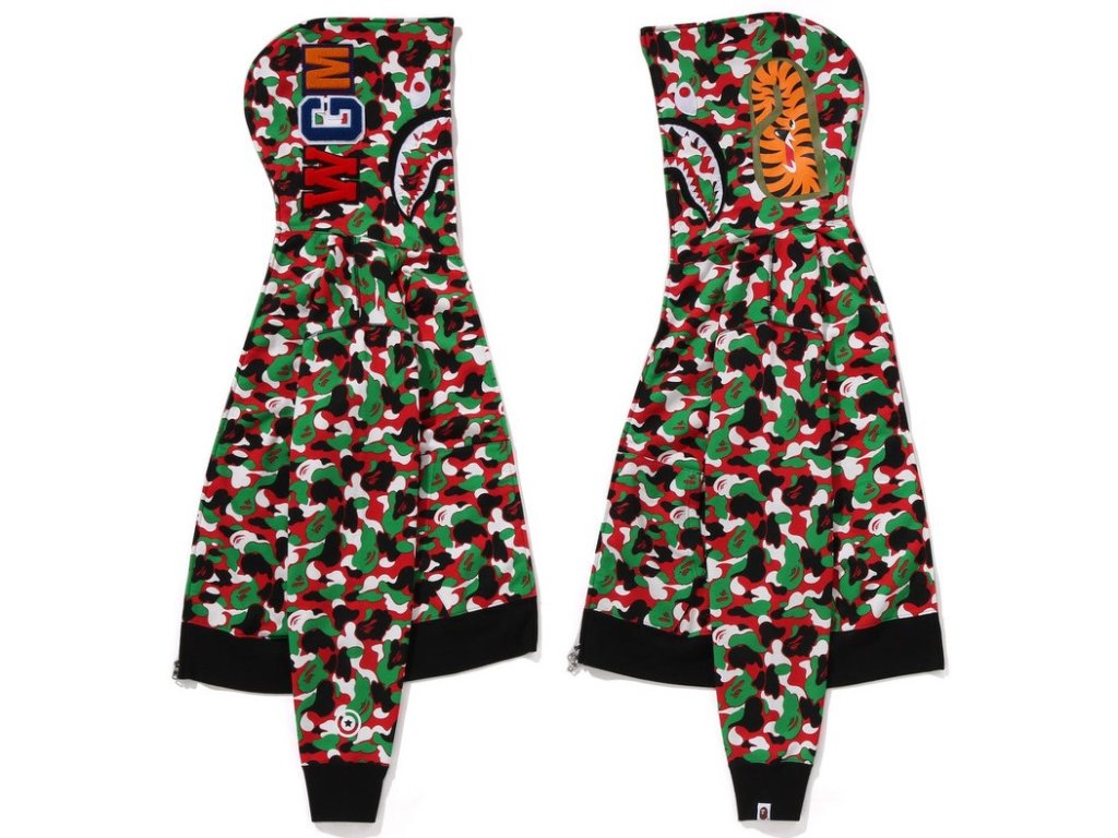 • Ikonická full zip mikina od japonské značky Bape (A Bathing Ape) v černé barvě s bílo-zeleno-červeným maskáčem.