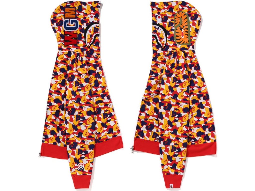 - Ikonická full zip mikina od japonské značky Bape (A Bathing Ape) červená mikina s žluto- bílo- červeným maskáčem.
