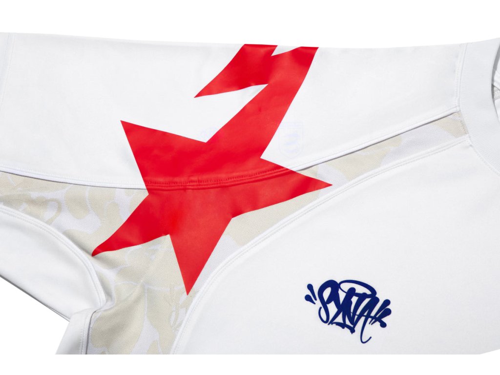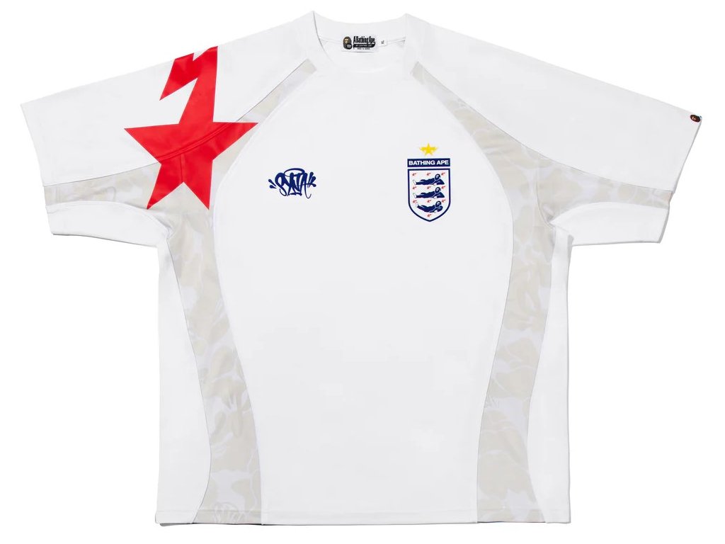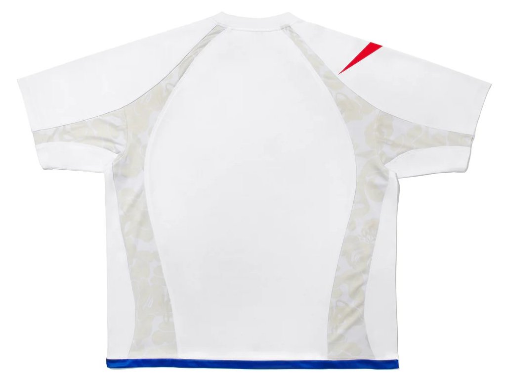 - Bílý fotbalový dres s krátkým rukávem od japonské značky Bape (A Bathing Ape).