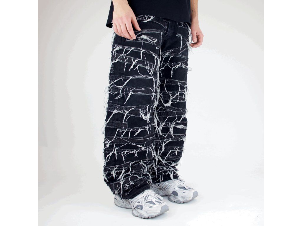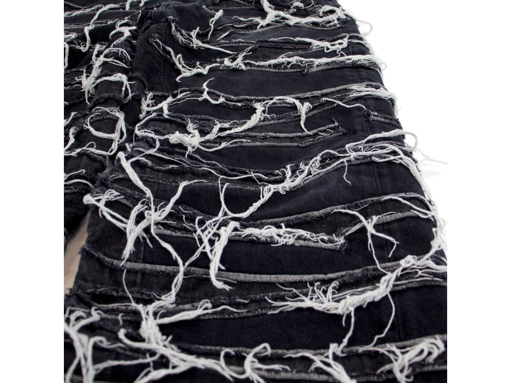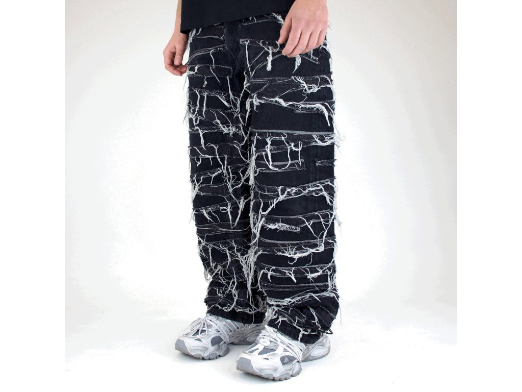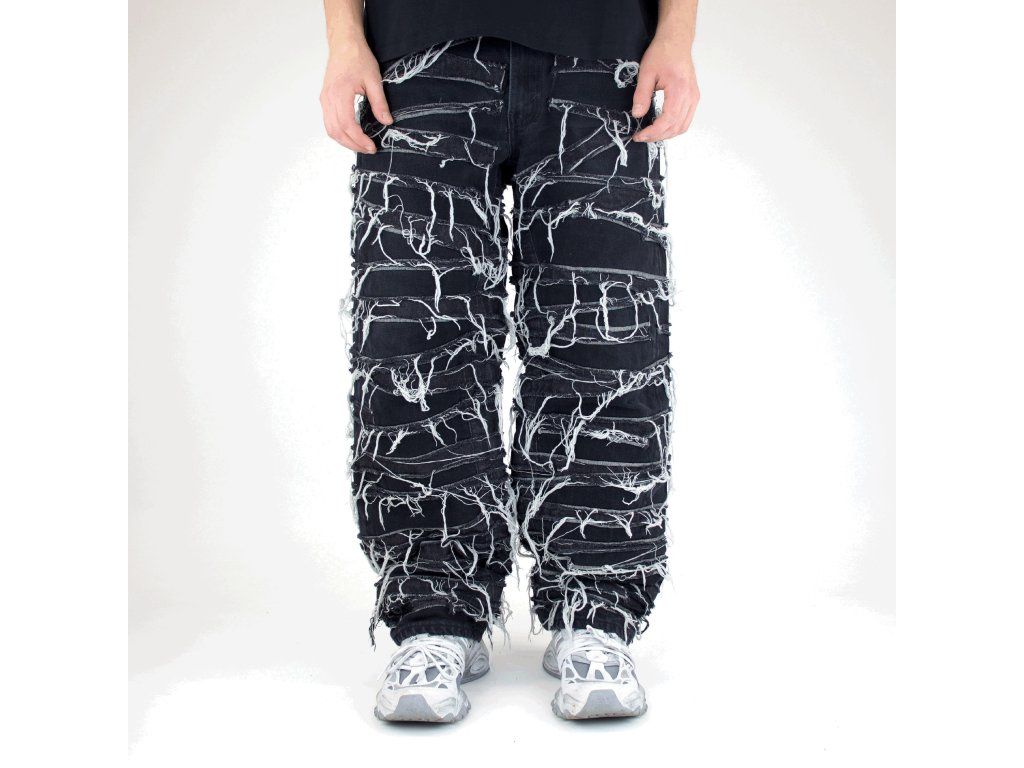 - Na kalhotách jsou našité potrhané kusy džínoviny.