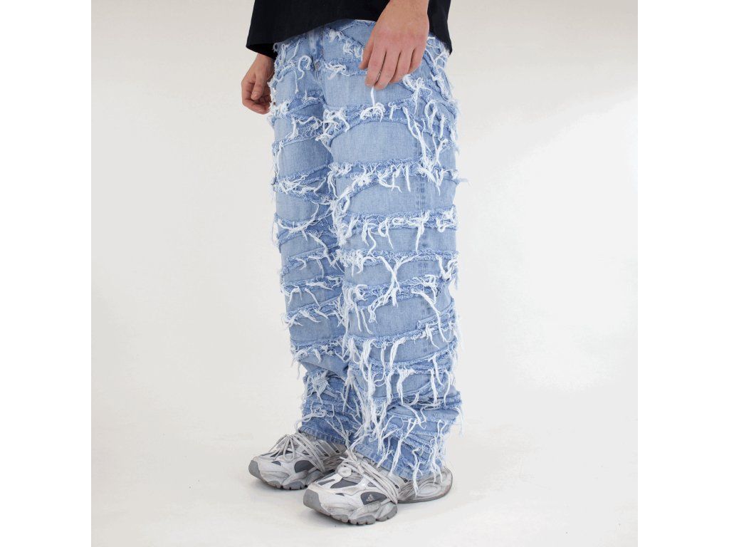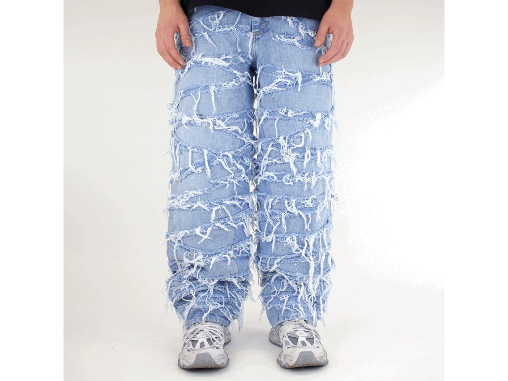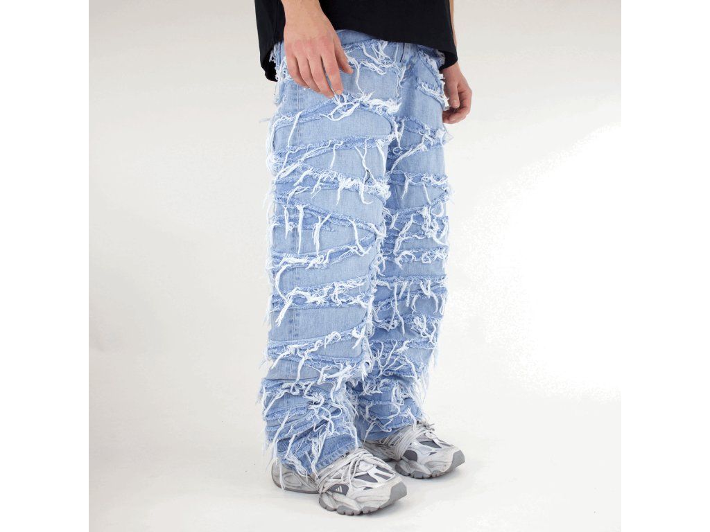 - Na kalhotách jsou našité potrhané kusy džínoviny.