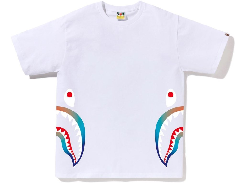 - Bílé tričko od japonské značky Bape (A Bathing Ape) s potiskem ikonického Shark motivu po straně.