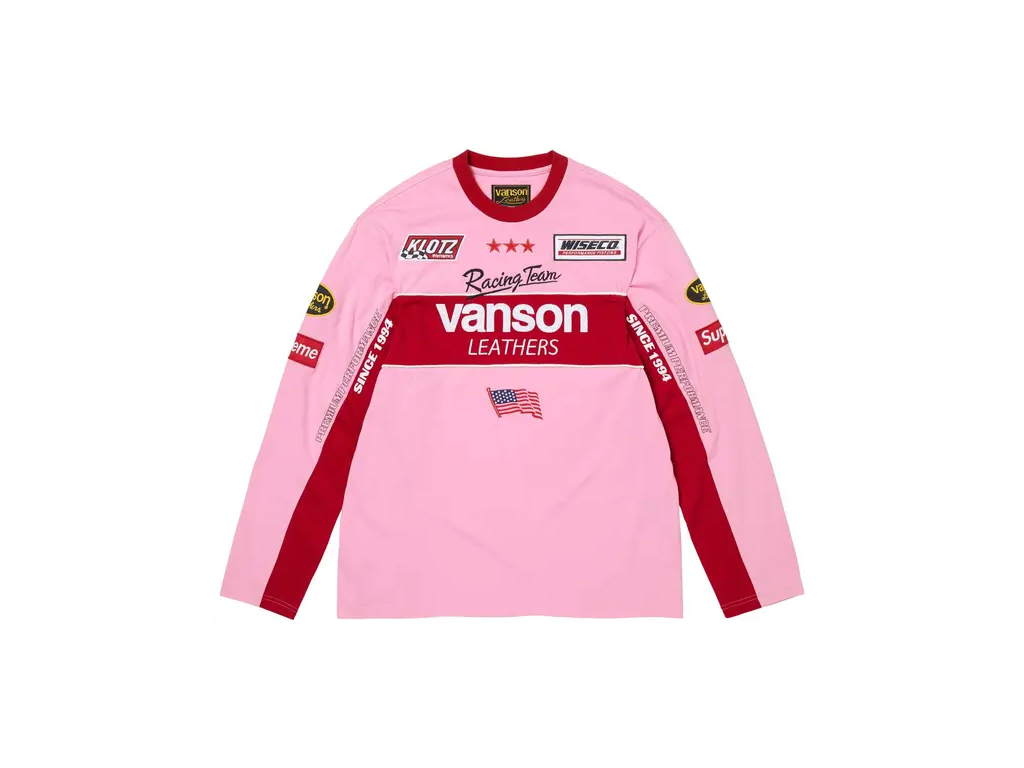 - Limitovaný long sleeve Supreme x Vanson Leathers v pink provedení přináší ikonické spojení streetwearu a motorkářské estetiky.